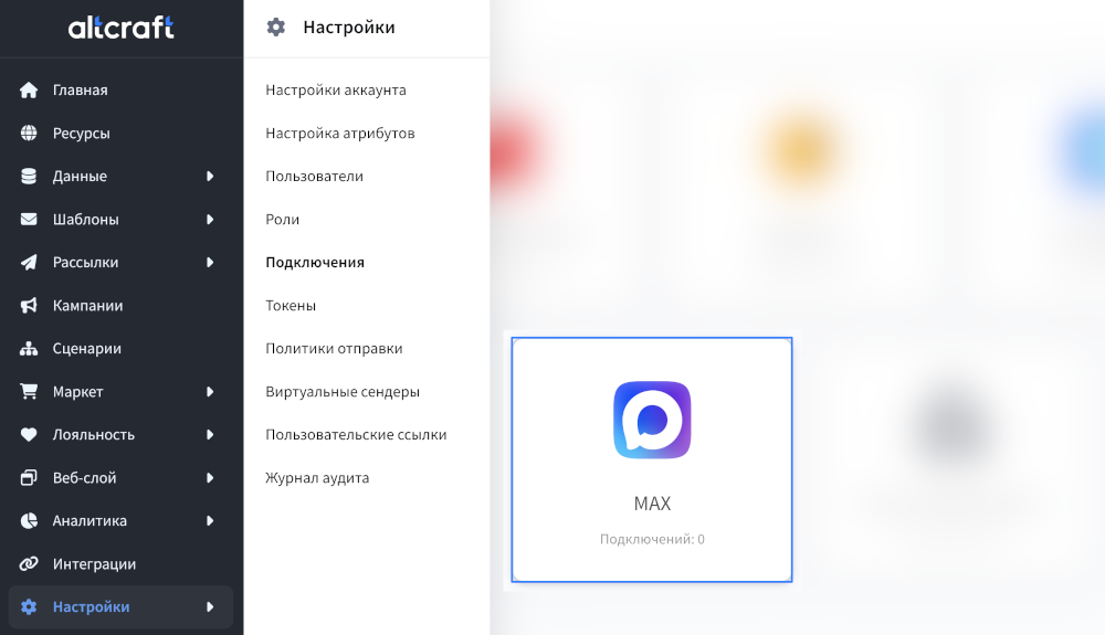 После этого перейдите в платформу и откройте Настройки — Подключения. В списке типов подключения выберите MAX: