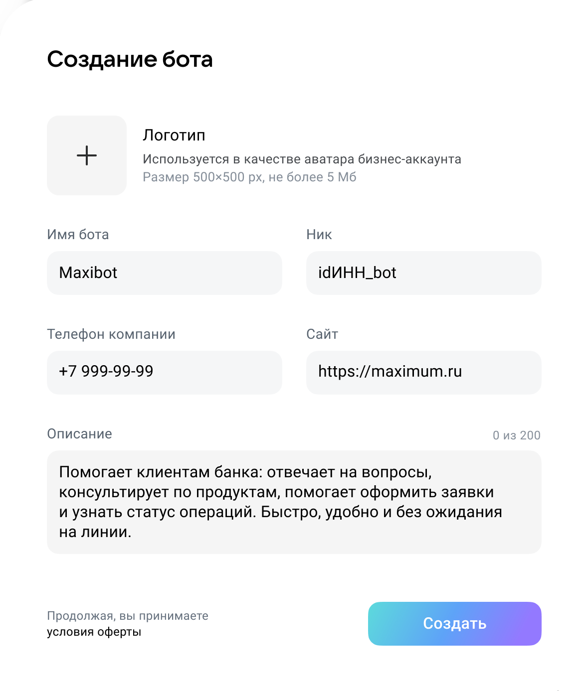 Нажмите Создать. Чат-бот будет отправлен на модерацию.