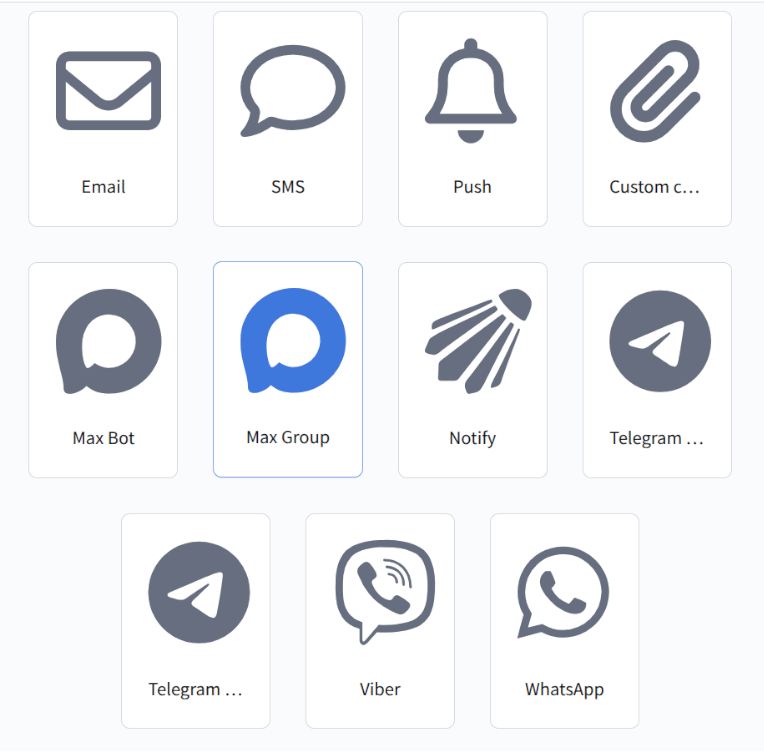 Перейдите в раздел Шаблоны. При создании нового шаблона выберите канал MAX Group или добавьте этот канал для уже существующего шаблона.