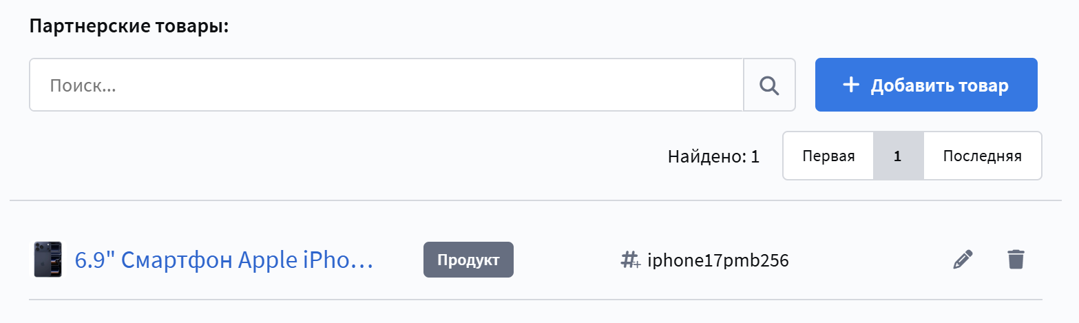 После создания и сохранения партнера вы можете привязать Партнёрские товары из маркета, к которым будут применяться партнерские условия.
