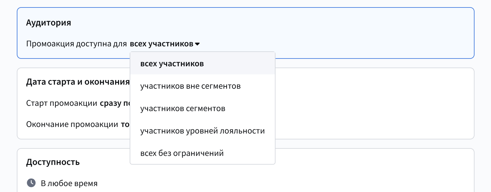 Раздел Основные предназначен для базовой настройки структуры программы лояльности. Здесь задаются ключевые параметры, которые определяют правила начисления, использования и отслеживания баллов, а также механизмы продвижения клиентов по уровням привилегий.
