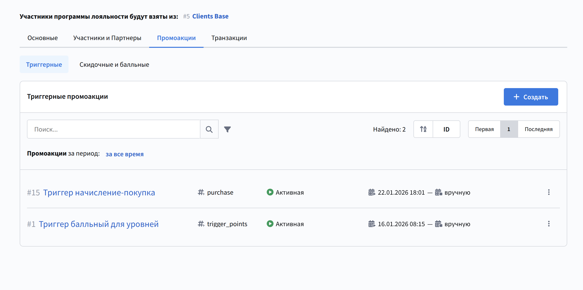 Чтобы начать новую программу лояльности, вверху страницы нажмите кнопку + Создать: