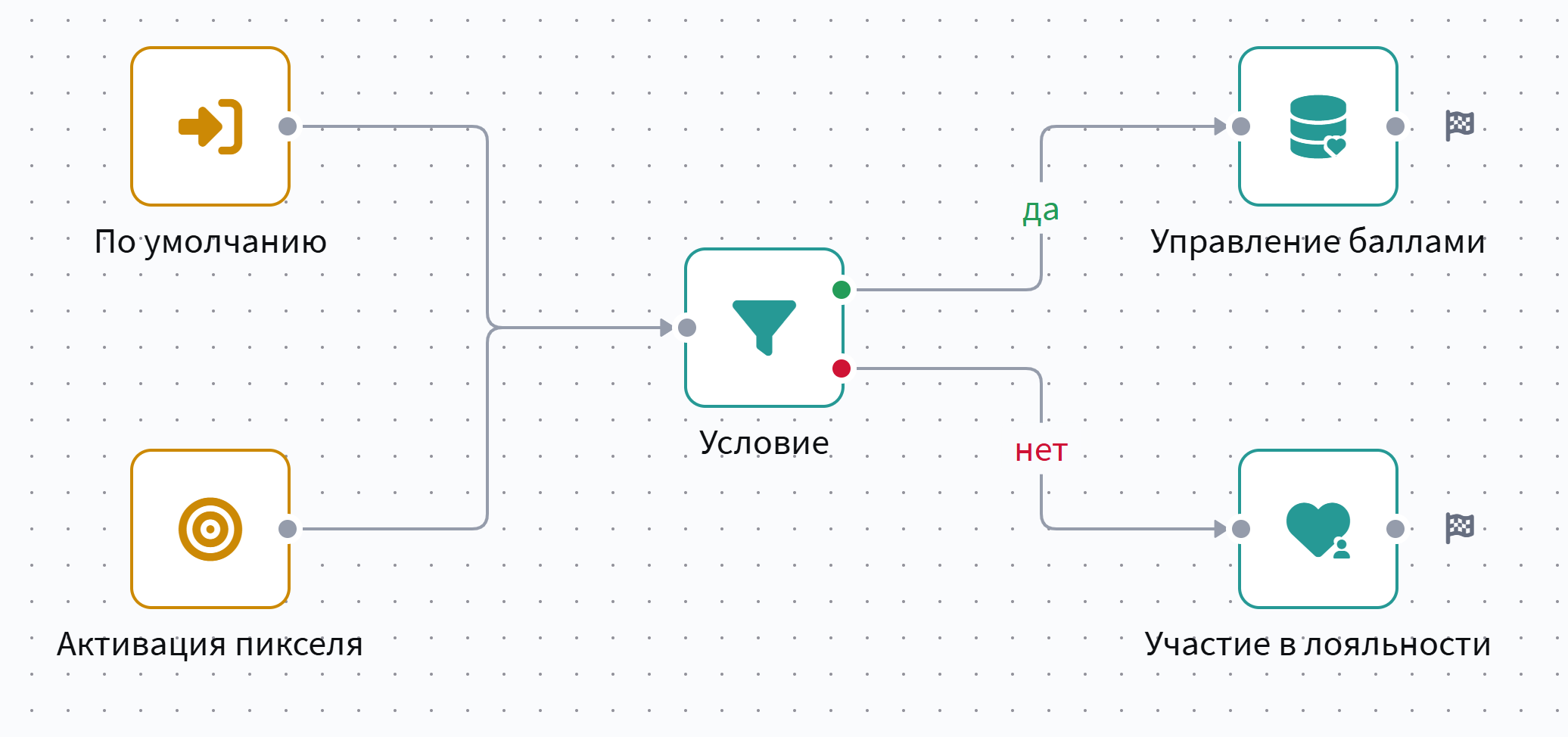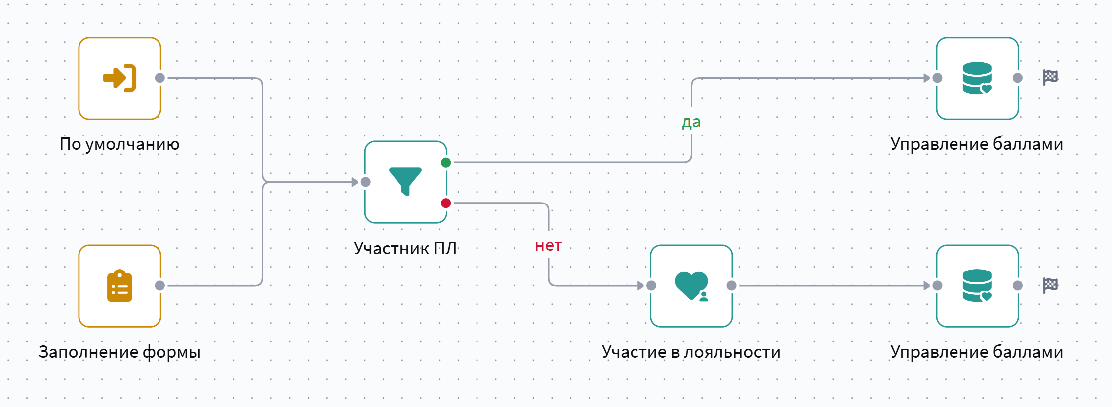 Если в настройках балла при регистрации указан нулевой начальный баланс, необходимо добавить узел "Управление баллами" (по аналогии с предыдущим), чтобы вручную начислить требуемое количество баллов.