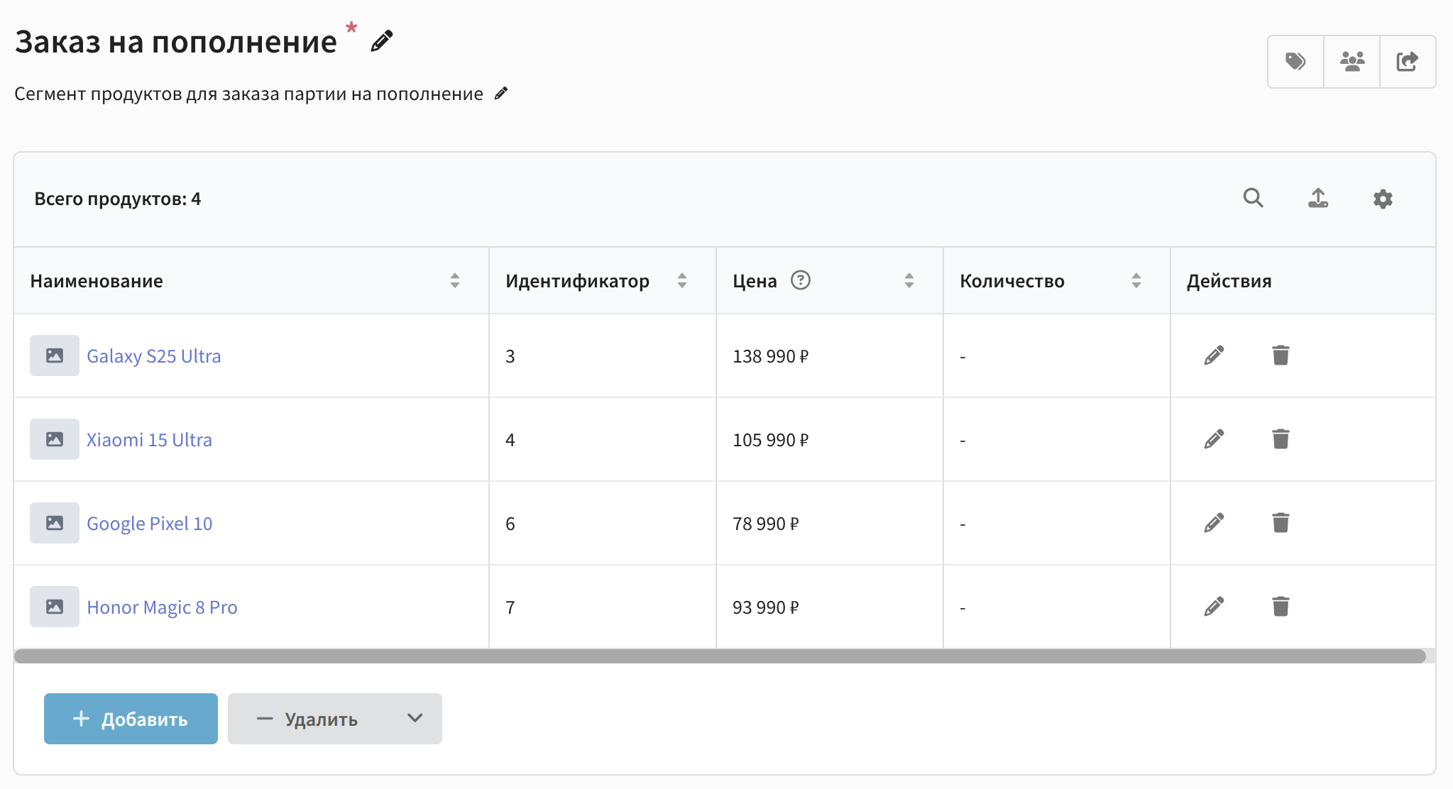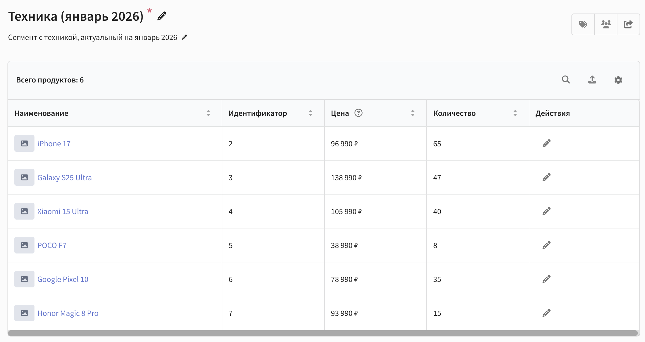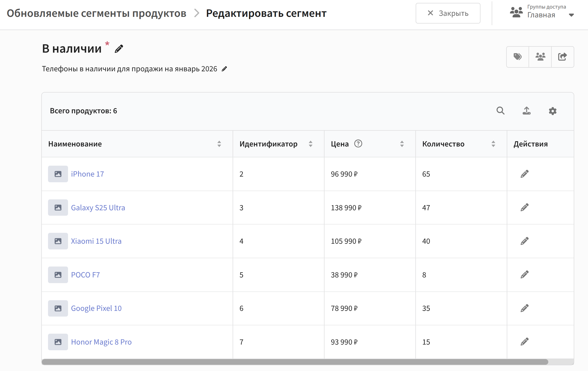После расчёта в окне сегмента отображается таблица со всеми продуктами, входящими в сегмент. В ней отображаются поля "Наименование", "Идентификатор", "Цена", "Количество", а также кнопка для перехода к редактированию продукта: