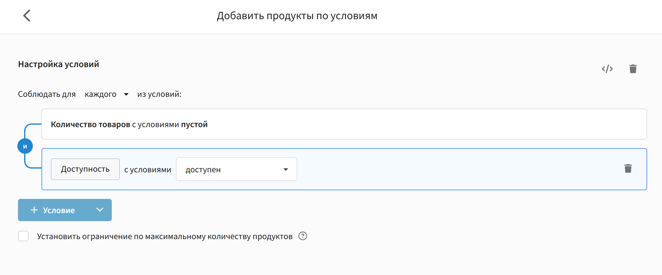 В этом же блоке доступна кнопка "Скрипт", открывающая редактор для ручного написания условий. После настройки условий можно задать ограничение на количество продуктов. Это ограничение применяется к результату выборки после отбора по условиям.