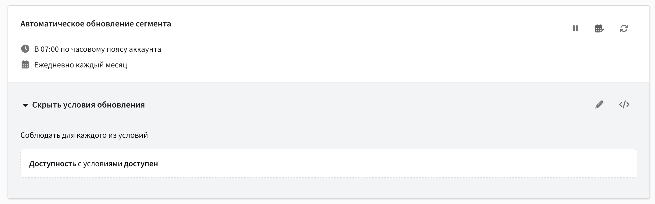Под таблицей продуктов расположено расписание и условия обновления сегмента. Здесь можно отредактировать эти условия или пересчитать сегмент вне расписания: