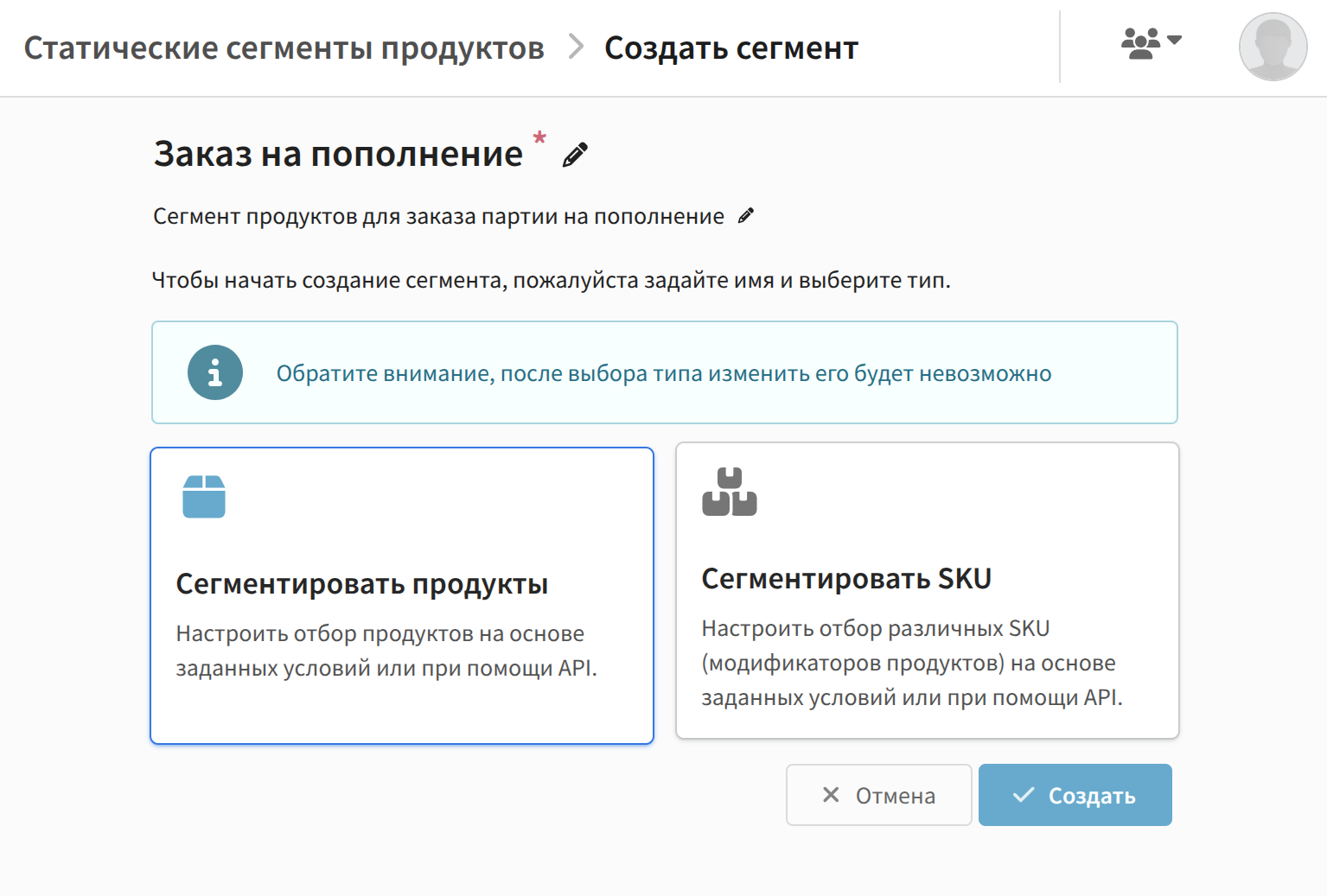 Нажмите "Создать". Укажите название, описание и выберите сущности для сегментации, продукты или SKU. После выбора изменить тип сегмента нельзя: