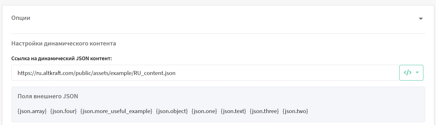 В ссылку на динамический JSON-контент можно включать различные переменные. Например, данные профиля {lead._fname}.