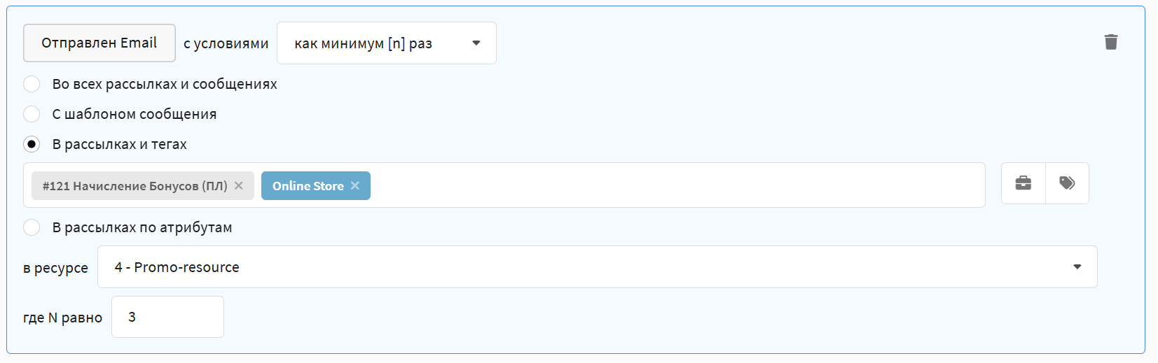 - Как минимум [n] раз — выборка по наличию указанного количества событий у подписчиков. В зависимости от оператора можно дополнительно указать Рассылку, Сообщение, период времени или количество дней с текущей даты.