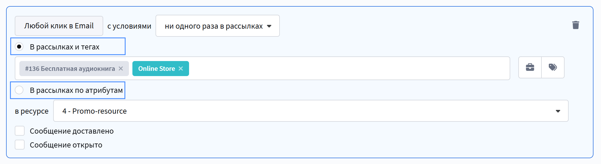 - Ни одного раза — выборка по отсутствию хотя бы одного действия выбранного типа. В зависимости от оператора можно дополнительно указать Рассылку, Сообщение, период времени или количество дней с текущей даты.