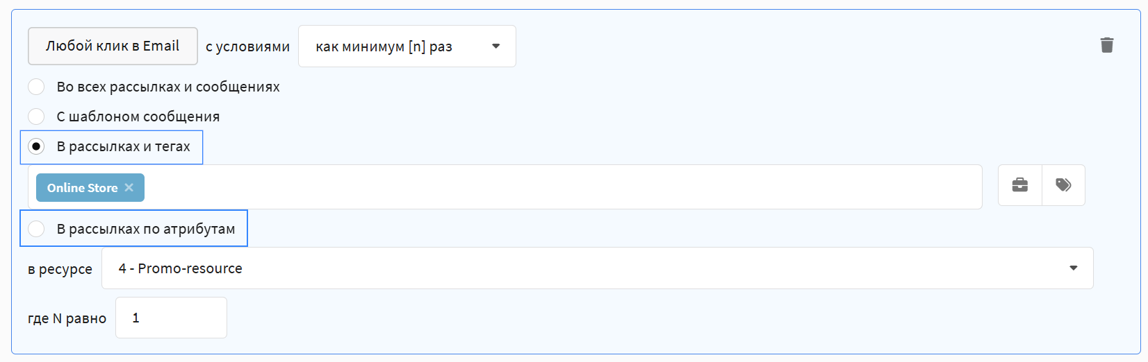 - Как минимум [n] раз в сообщениях / в рассылках — профиль попадёт в сегмент, если действие произошло в любом из выбранных шаблонов или рассылок.