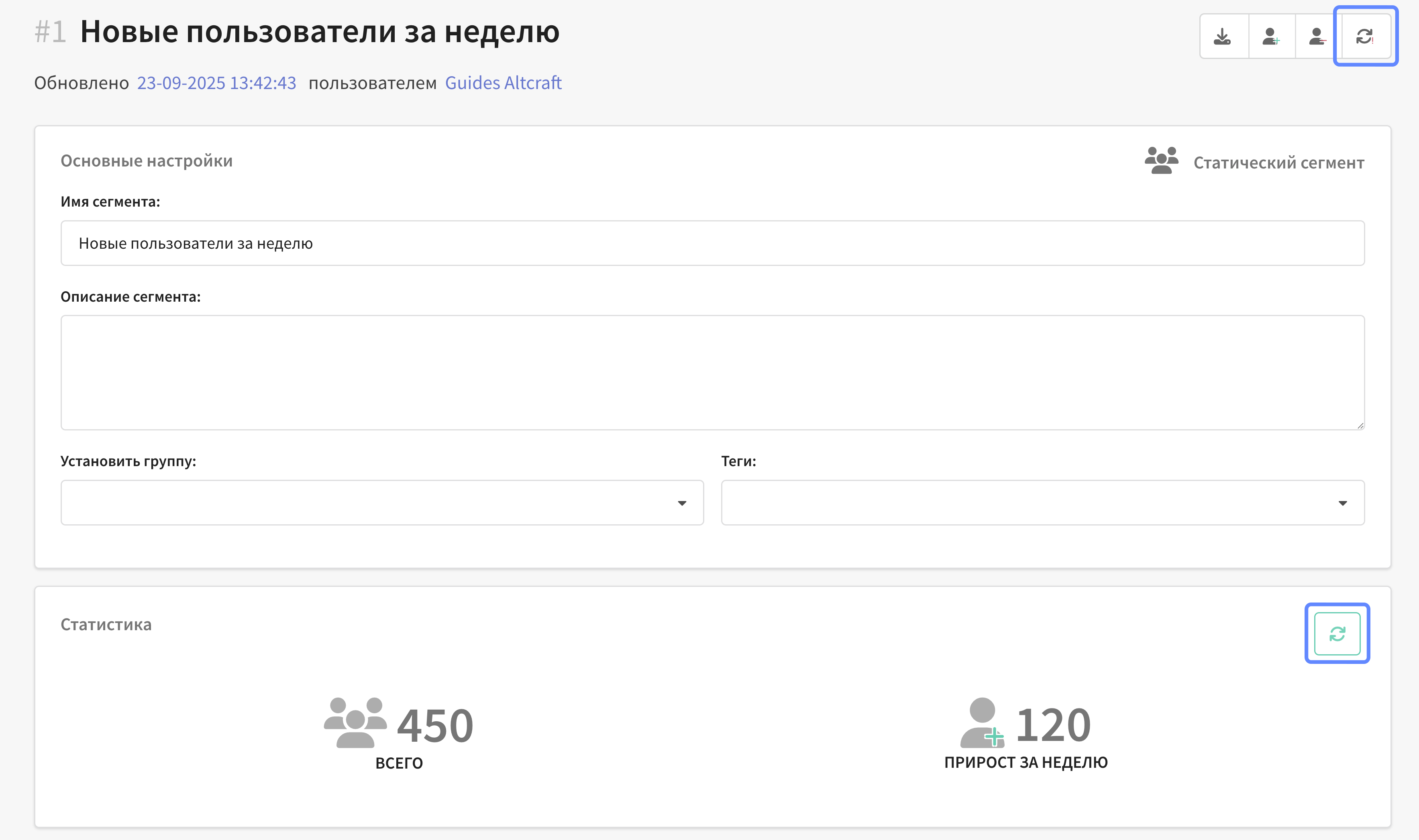 Кнопка в блоке "Статистика" — обновляет только отображаемые показатели ("Всего", "Прирост за неделю"). Эта кнопка не запускает пересчёт сегмента.