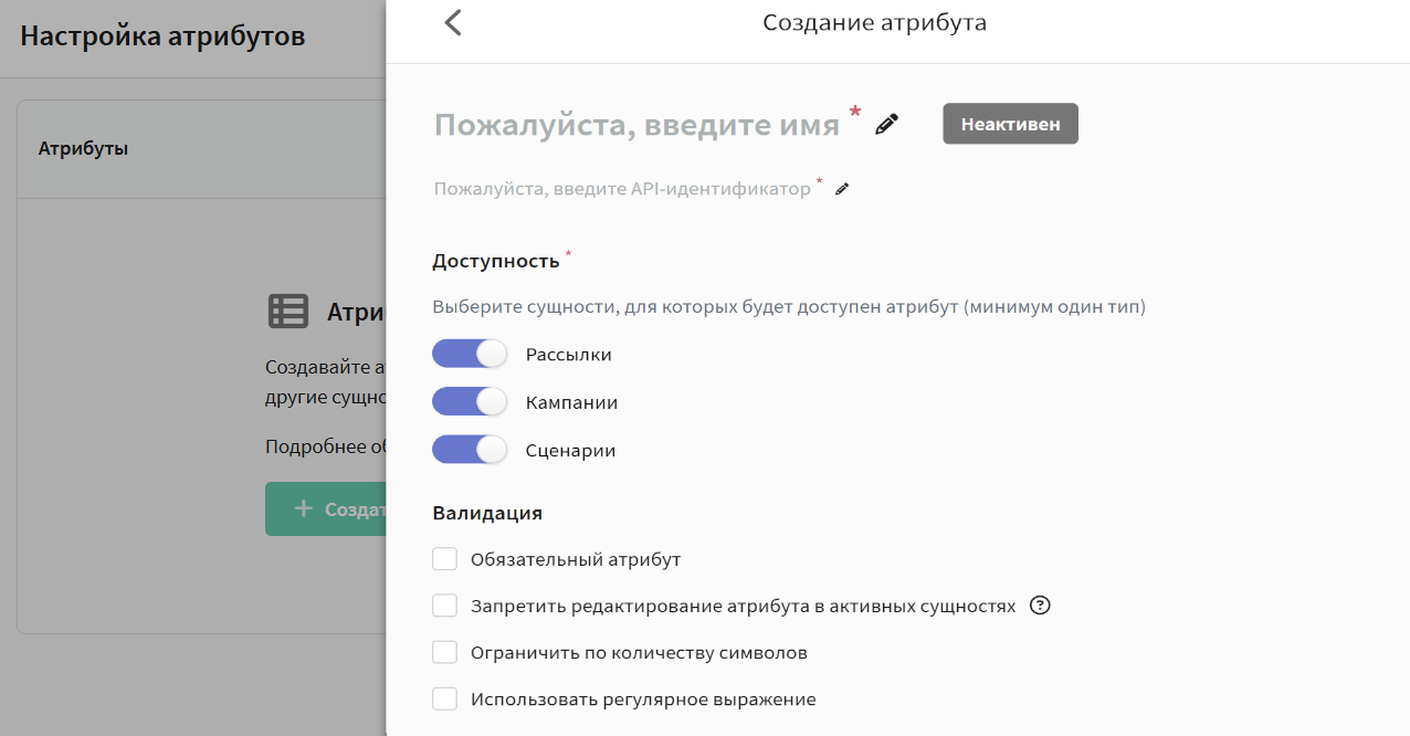 • Обязательный атрибут — для любой созданной сущности, в которой доступен атрибут, необходимо указать его значение. Без этого кампания, рассылка или сценарий не будут сохранены.