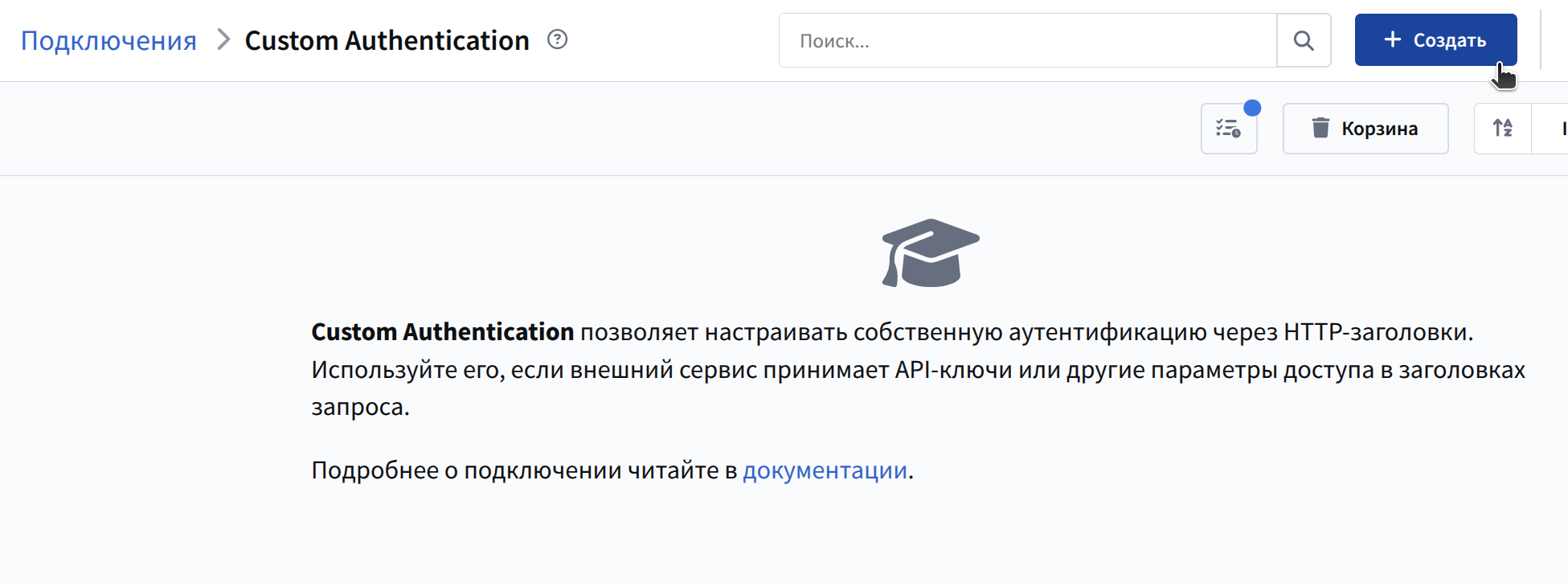 Откроется список всех настроенных Custom-подключений. Чтобы добавить новое, нажмите + Создать.
