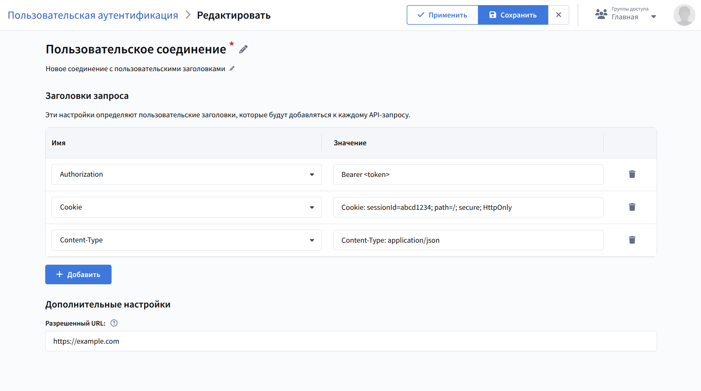 Задайте имя нового подключения и при необходимости добавьте описание. Затем добавьте желаемые заголовки и укажите их значение. Вы можете выбрать заголовки из выпадающего списка или указать собственные.