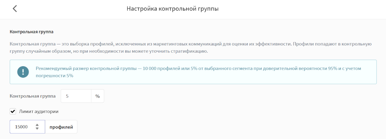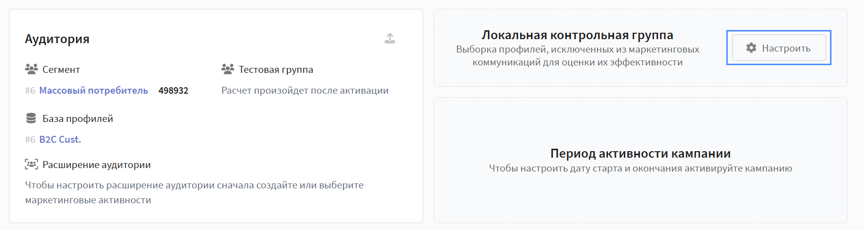 Обратите внимание, что при включении ЛКГ в кампании, которая уже была активна, состав контрольной группы будет формироваться только из профилей, попавших в кампанию после ее активации, например в результате расширения аудитории. Профили, попавшие в тестовую группе при первой разметке, остаются в тестовой группе.