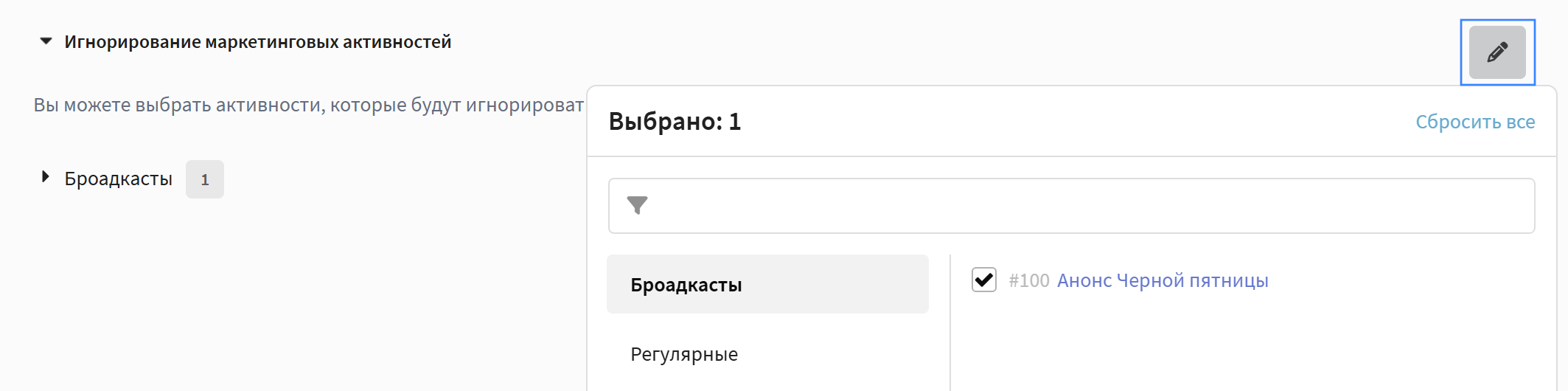 Настройка "Игнорирование маркетинговых активностей" позволяет выбрать конкретные активности внутри кампании, которые будут отправлять сообщения всем профилям, включая участников контрольной группы. Это полезно для критически важных уведомлений, которые должны доходить до всей аудитории независимо от участия в ЛКГ.