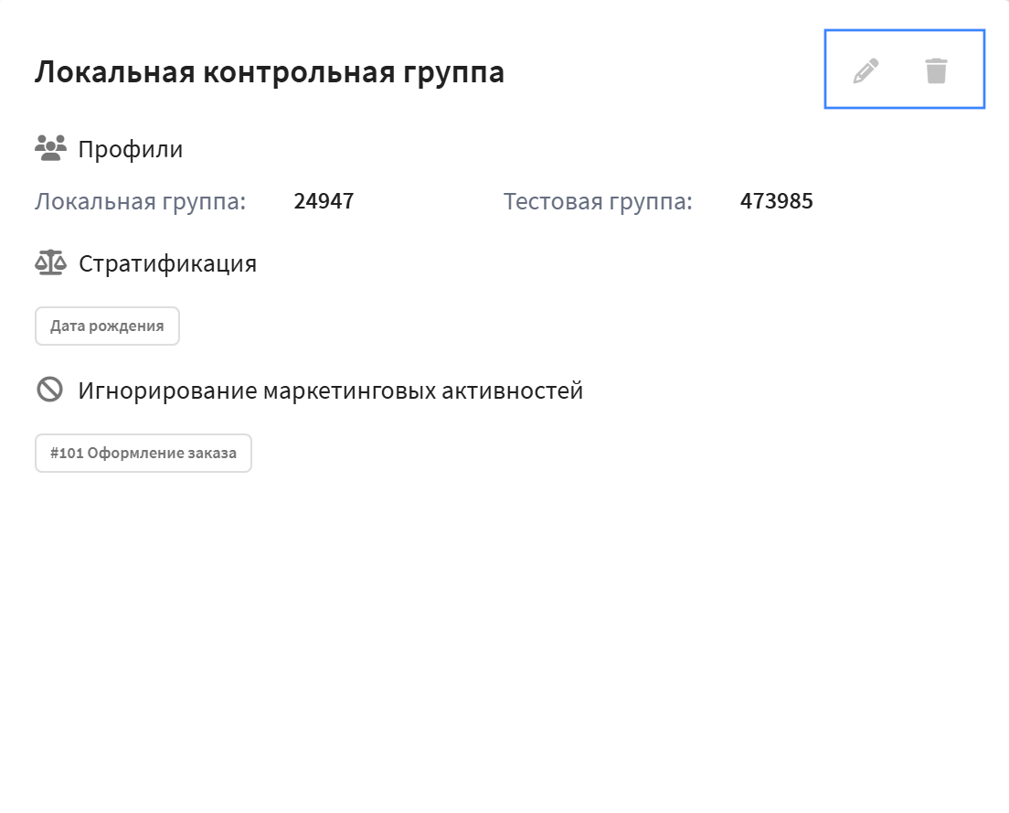 • Удалить ЛКГ — полное удаление локальной контрольной группы. Вместе с ЛКГ будут удалены все связанные настройки (Стратификация и Игнорирование маркетинговых активностей). В результате этого действия профили из контрольной группы будут перемещены в тестовую;