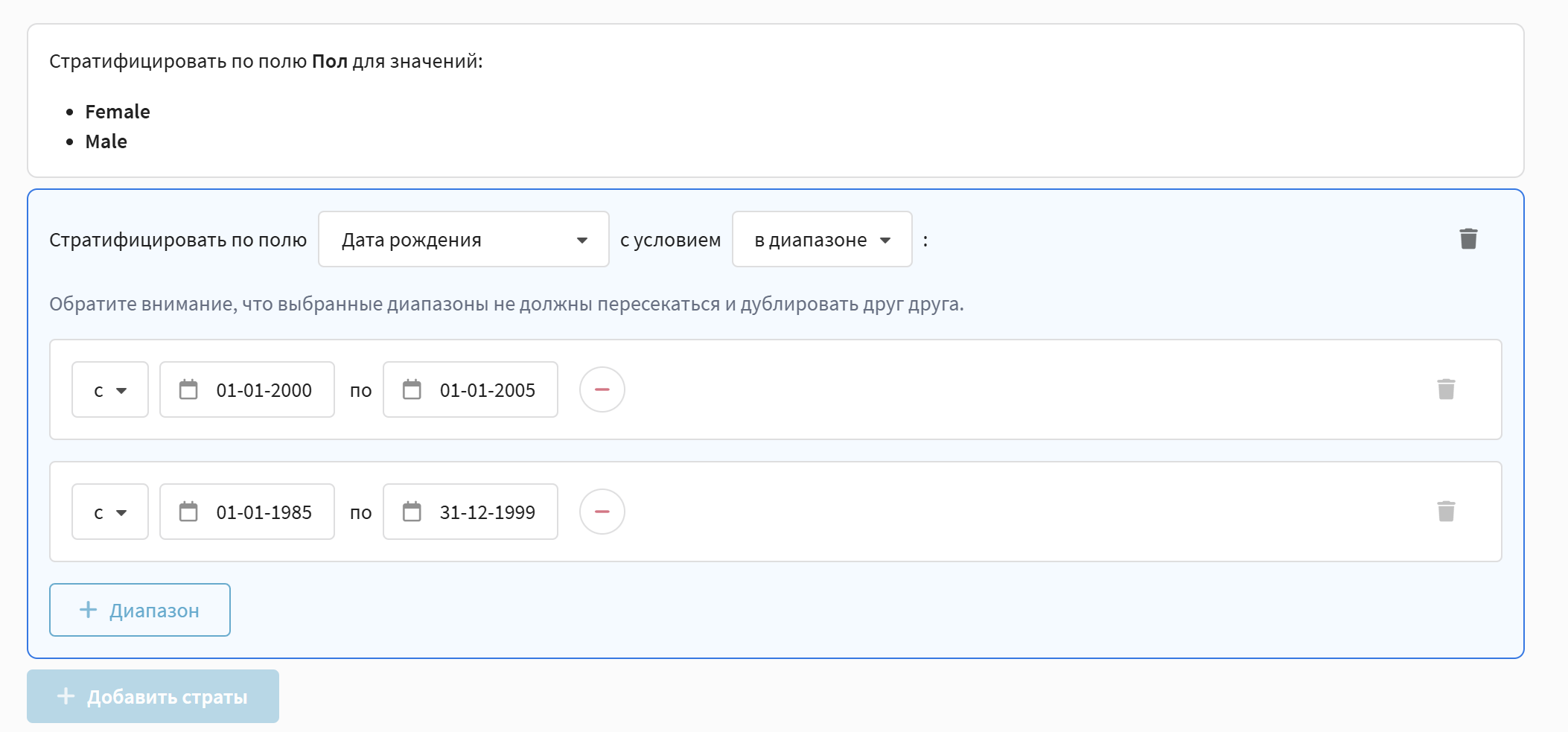 Задайте страты по одному или нескольким полям, определив условия для каждой группы: например, диапазоны дат, числовые значения, группы элементов из списка и т.д. Настройка стратификации осуществляется через пользовательский интерфейс, где можно последовательно добавлять страты и задавать параметры для каждой из них: