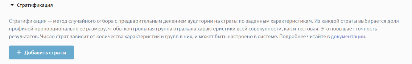 Если вы изменяете набор полей стратификации (например, добавляете стратификацию по полю age или убираете по полю region) — это уже совсем другая сетка деления. Текущие участники ЛКГ не соответствуют новым стратам, система не может сопоставить старых участников с новыми стратами и отправляет их всех в тестовую группу. Контрольная группа начинает формироваться заново и только из новых пользователей.
