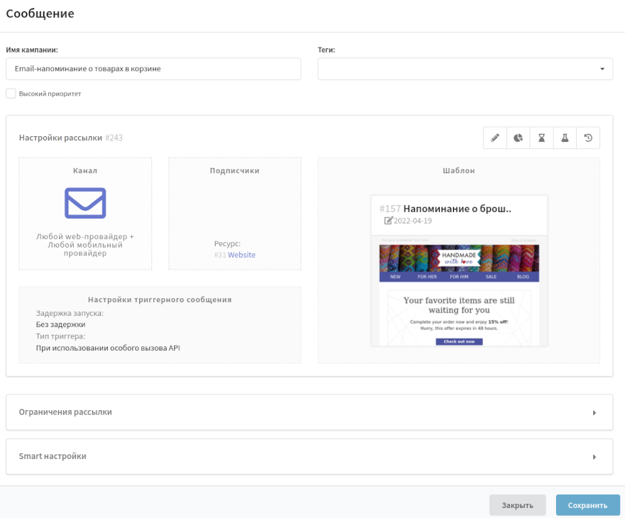 В некоторых ситуациях посетитель сайта может открывать корзину не один раз. Чтобы не заспамить почту клиента, отправляя несколько email-напоминаний в одну неделю, блокируйте повторное срабатывание пикселя для корзины в течение 7200 минут (5 дней).