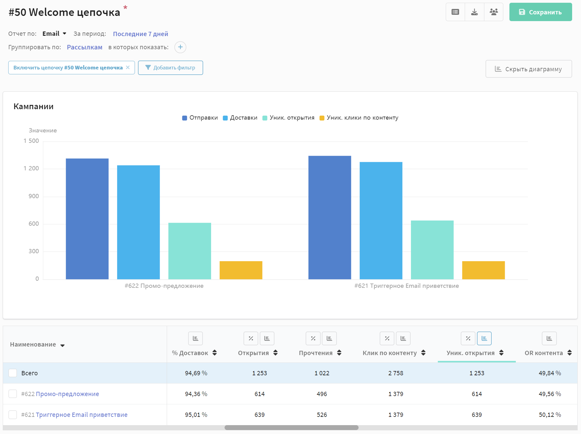 Чтобы начать работу со сценариями взаимодействия с клиентами, в главном меню выберите Сценарии. В открывшемся списке отображается краткая информация по существующим сценариям, их статусы активности, а также количество профилей, которые в данный момент находятся в сценариях.