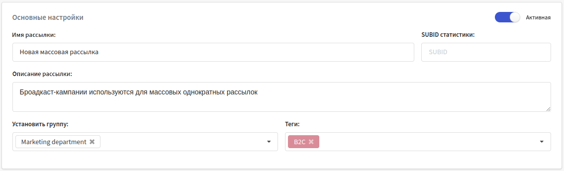 В основных настройках укажите название и описание новой кампании, при необходимости установите группу доступа, теги и атрибуты для дополнительной группировки. Здесь же вы можете указать SUBID статистики для кампании. В верхнем правом углу находится переключатель, активирующий кампанию: