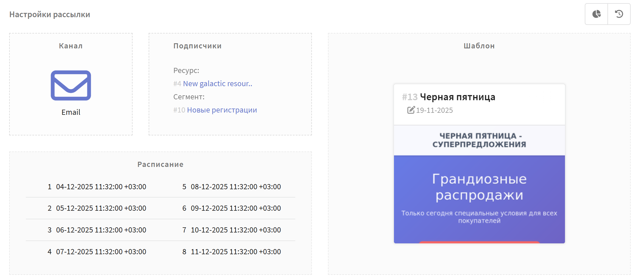 ![]() | Чтобы создать новый броадкаст, в главном меню выберите Кампании —> Броадкасты и нажмите кнопку + Создать. Или воспользуйтесь календарём кампаний. |