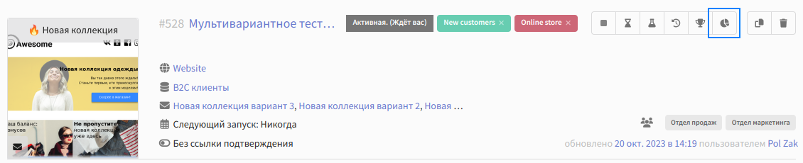 ![]() | Чтобы создать новый мультивариантный тест, в главном меню выберите Кампании —> Мультивариантные тесты и нажмите кнопку + Создать. Или воспользуйтесь календарём кампаний. |