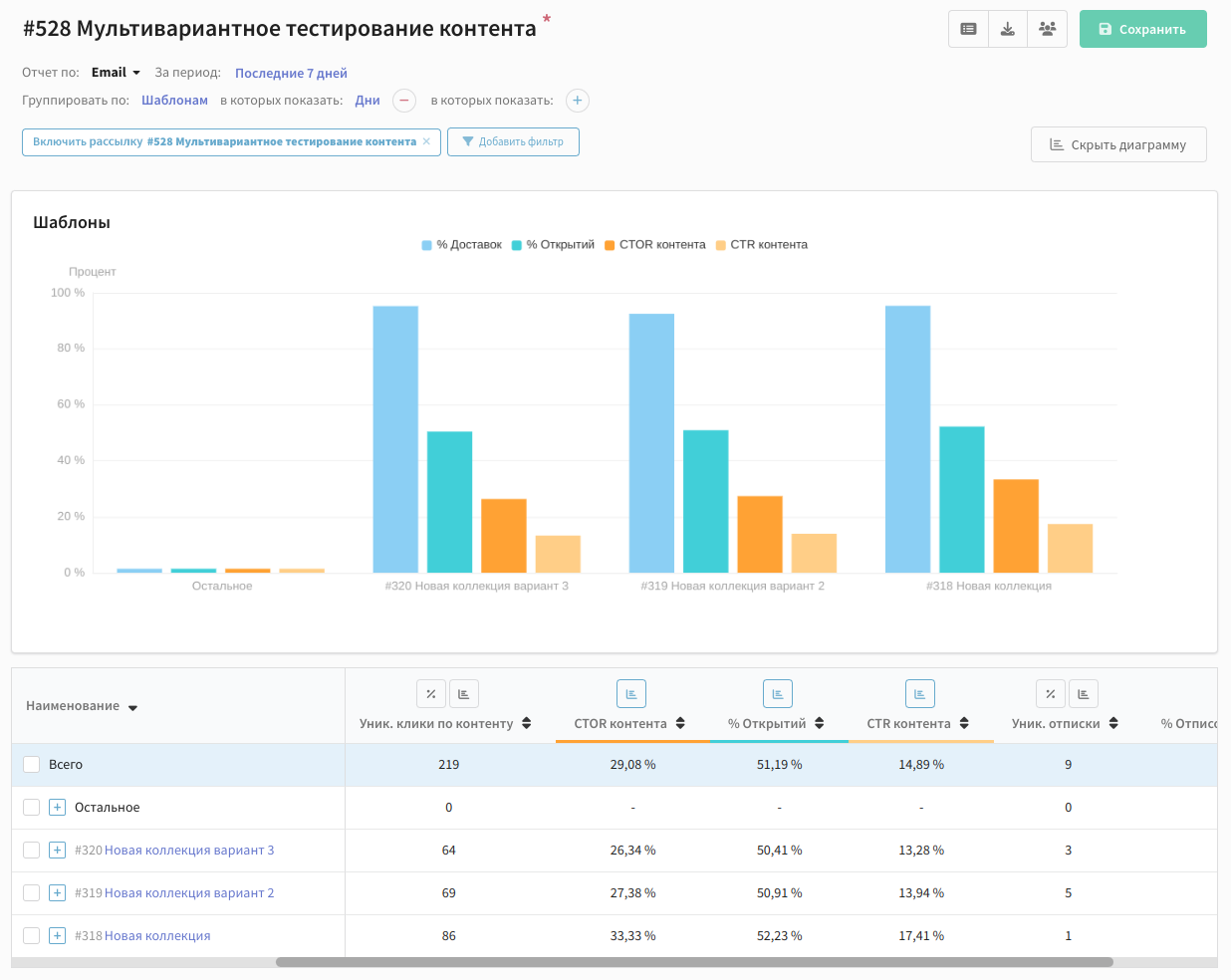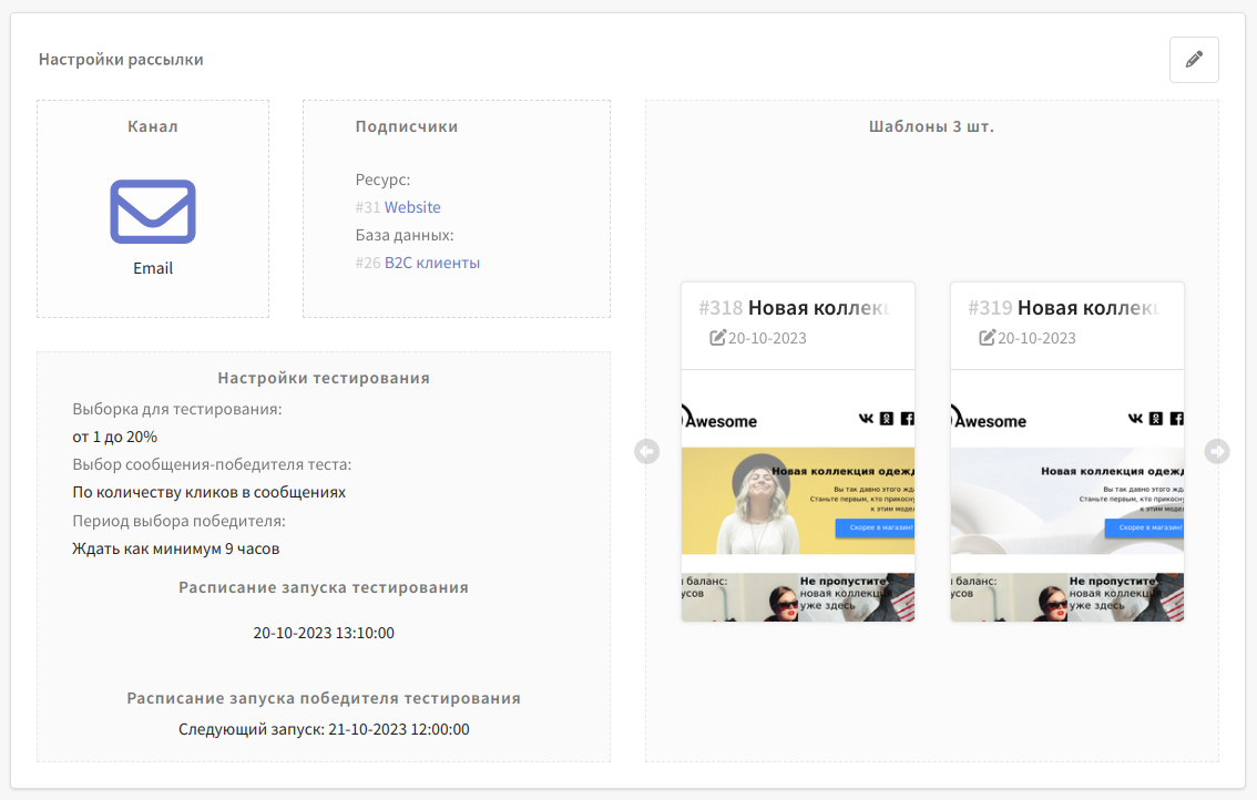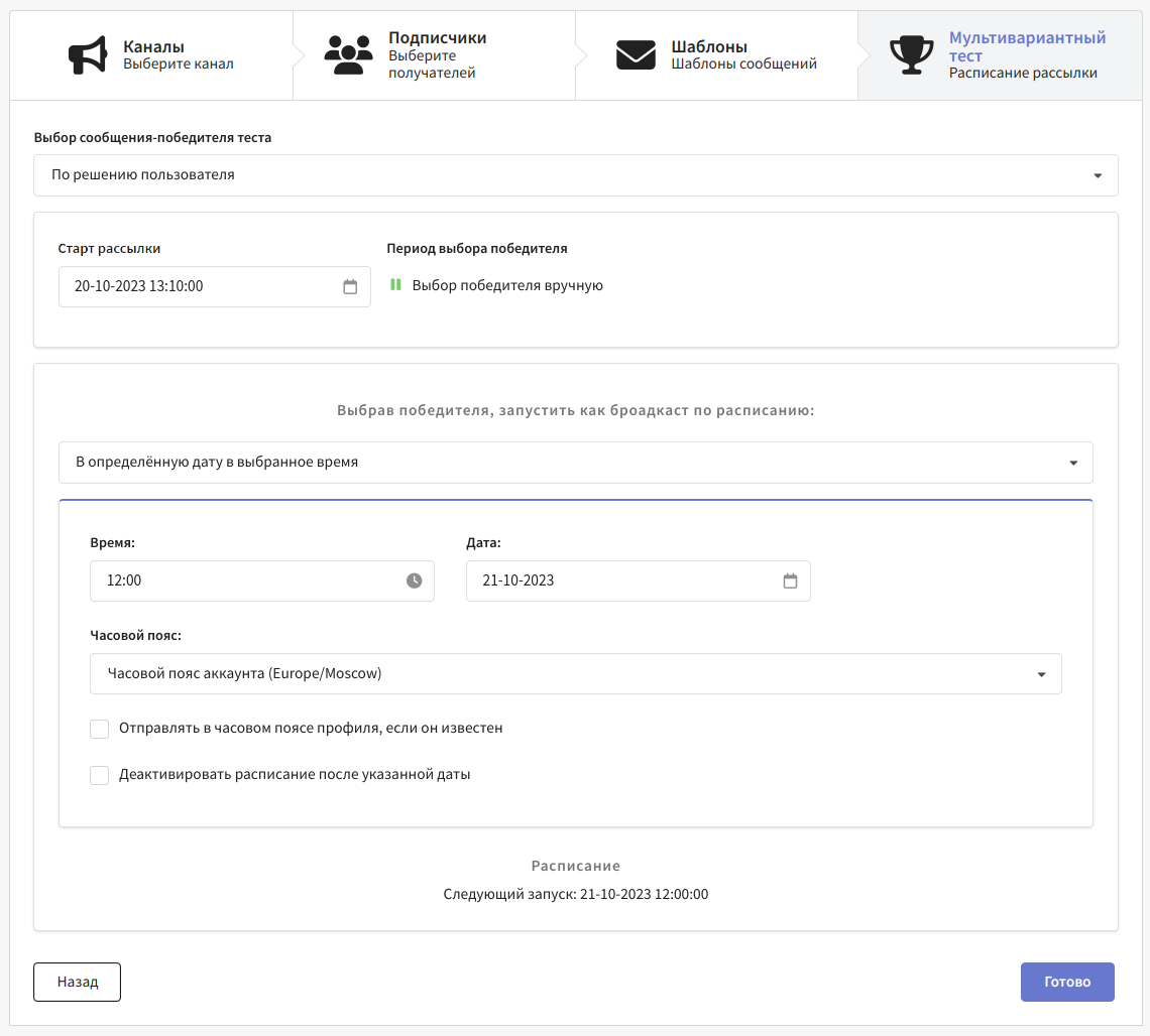 Мультивариантный тест — кампания, в которой несколько (до 8) шаблонов сообщений отправляется части аудитории для сравнения их эффективности. После чего определяется шаблон-победитель, который отправляется остальной части аудитории. Рассылает по одному сообщению всем подписчикам из своего источника данных: тестовой части и основной - по заданному расписанию. Когда каждому из получателей будет отправлено одно сообщение, кампания завершится так же, как броадкаст.