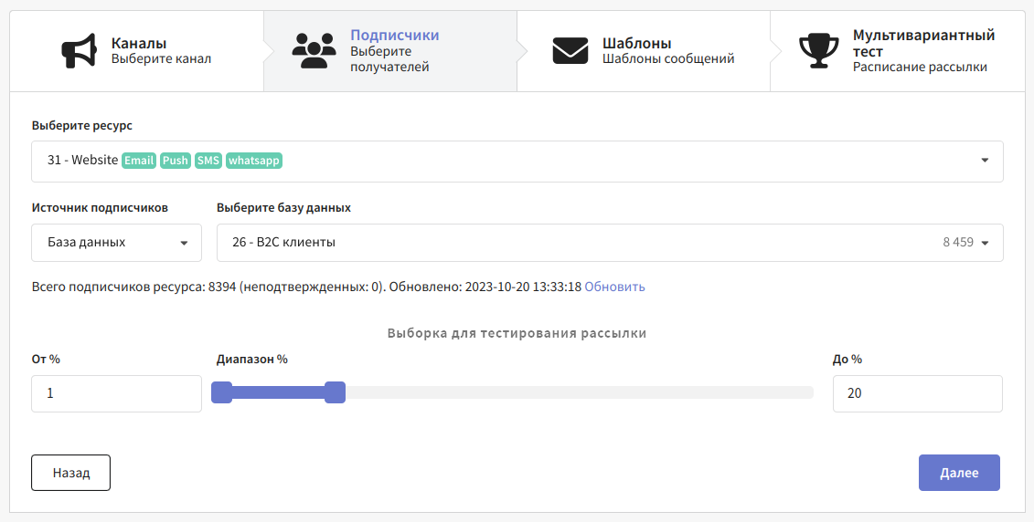 В первой вкладке выберите канал связи, по которому хотите отправить кампанию. Канал отправки должен быть доступен хотя бы в одном ресурсе подписок. Ресурс выбирается в следующей вкладке.