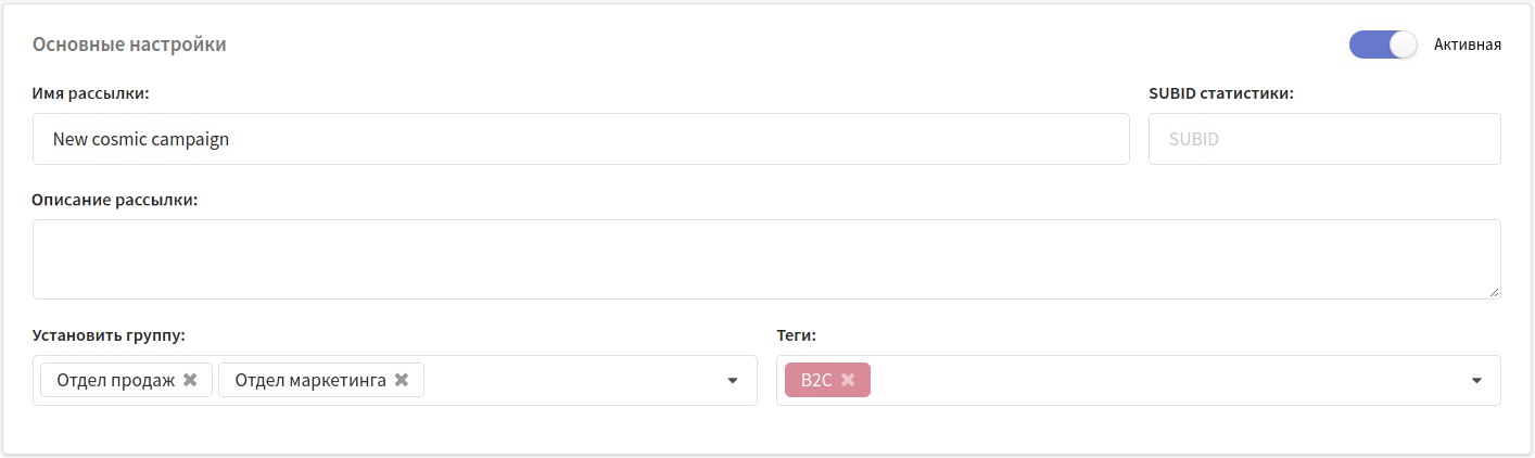 В основных настройках укажите название и описание новой кампании. При необходимости установите группу доступа, теги и атрибуты для дополнительной группировки. В верхнем правом углу находится переключатель, активирующий кампанию: