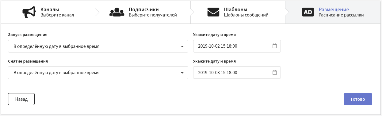 Кампания размещения — инструмент для размещения контента подписчикам на определенном ресурсе с возможностью последующей отмены. При запуске отправляет контент каждому подписчику в источнике данных (в случае старта по расписанию) или конкретному лиду, инициировавшему определенное событие (при триггерном условии старта). Если в канале настроена возможность отмены рассылки, то размещенный контент может быть убран с ресурса в ручную или по достижению определенной даты и времени.