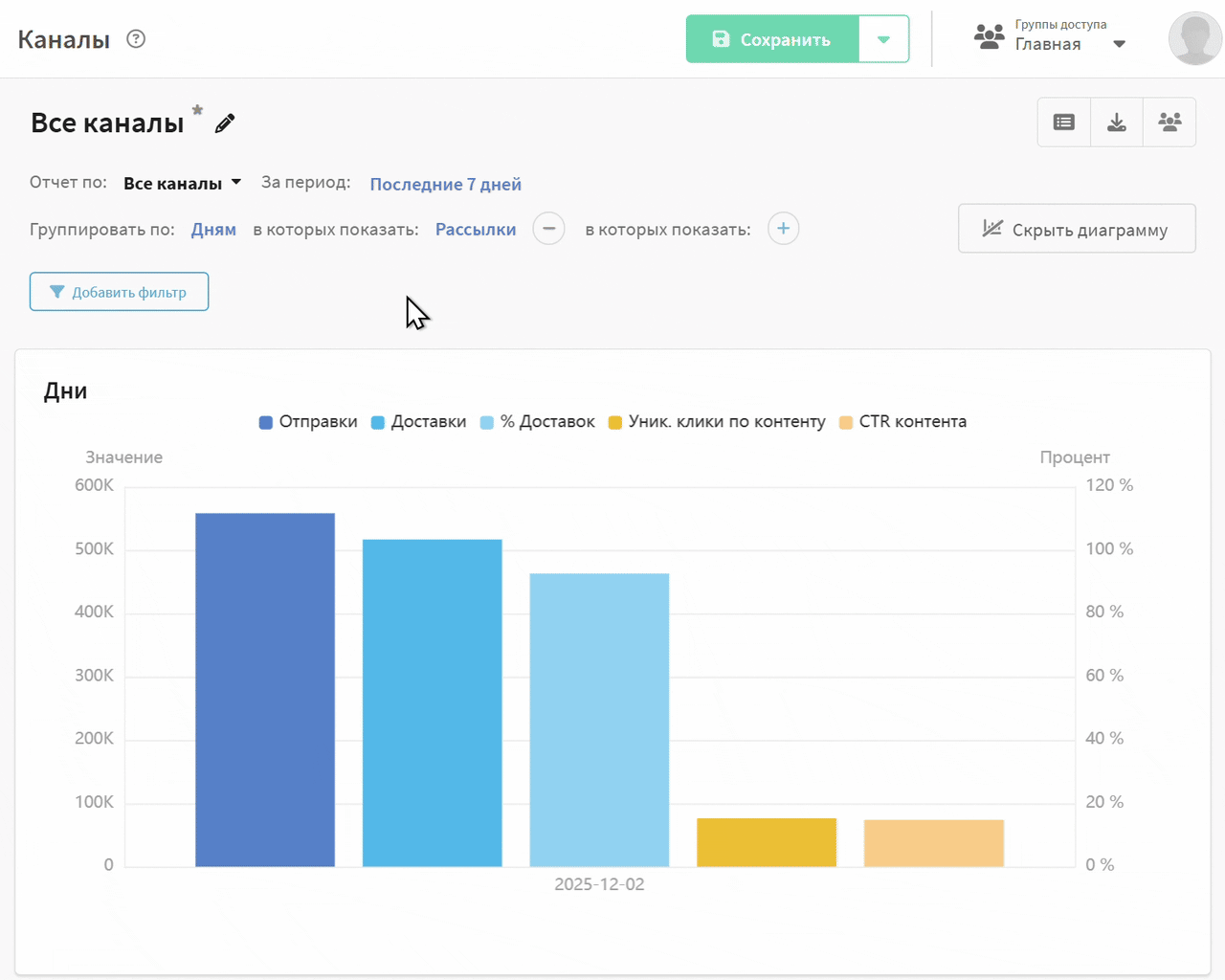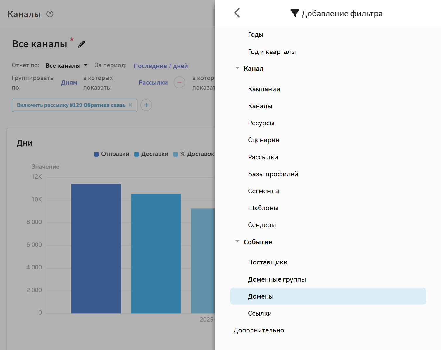 Для оценки результатов текущей рассылки вы можете просмотреть отчет по каналу. Отчёт по каналам предоставляет аналитику по одной или нескольким кампаниям, по выбранному каналу связи.
