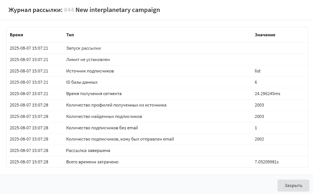 Журнал кампании — это инструмент, предоставляющий краткую сводку о ходе выполнения рассылки. В нем фиксируются ключевые события, параметры кампании и статистика, что позволяет выявить возможные проблемы.
