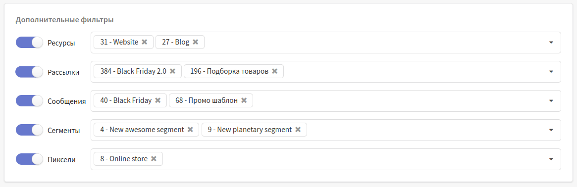 - Пиксели — будут захвачены действия подписчиков на внешних ресурсах, зарегистрированные определёнными пикселями.