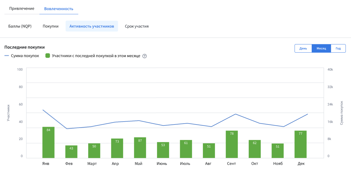 Информация в этом разделе показывает вовлеченность участников программы на основе их активности. Содержит вкладки Баллы, Покупки, Активность участников и Срок участия.