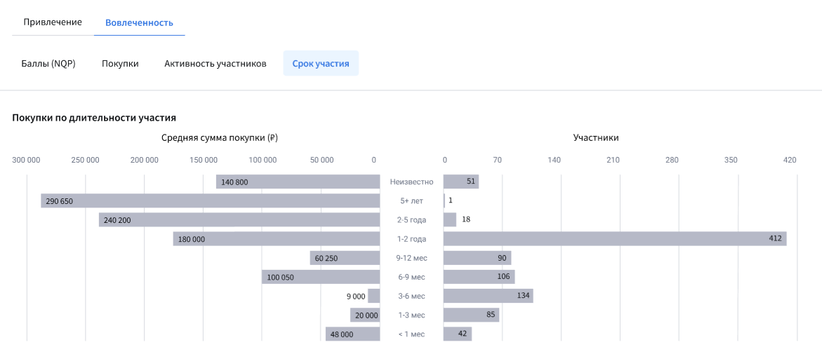 В разделе содержится гистограмма с информацией по участникам программы, их средней сумме покупки и длительностью участия в программе лояльности: