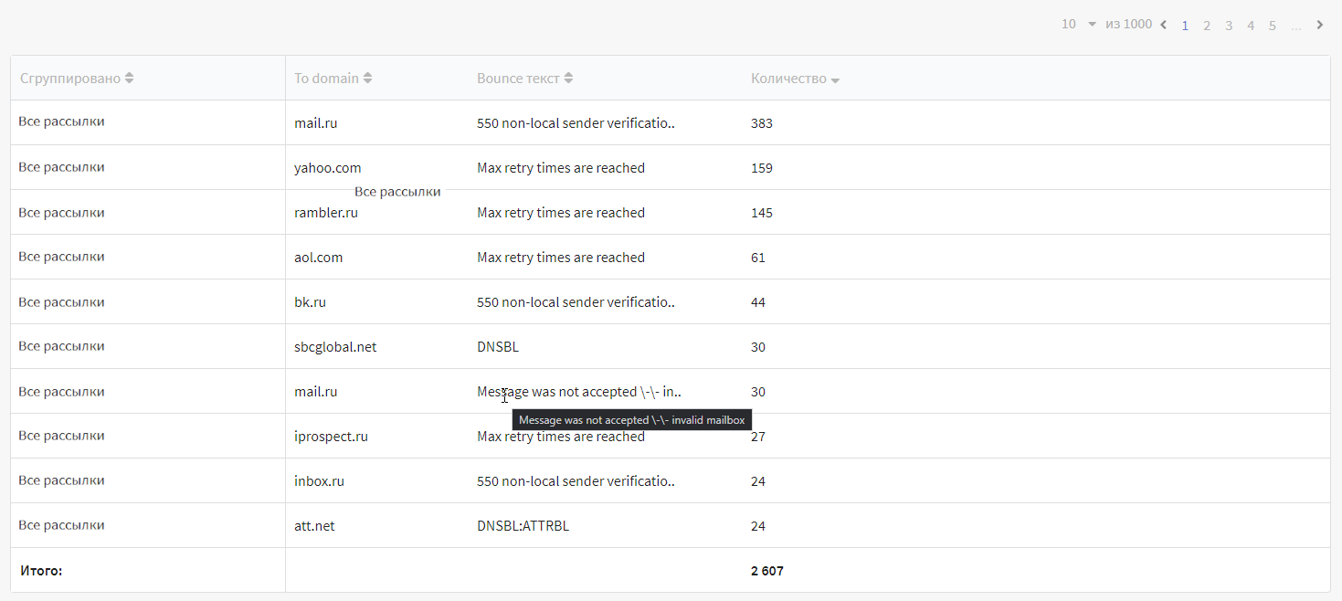 Чтобы ознакомится с полным текстом ошибки, наведите курсор на Bounce-текст. Список распространённых ошибок доставки и их описание представлены в таблице: